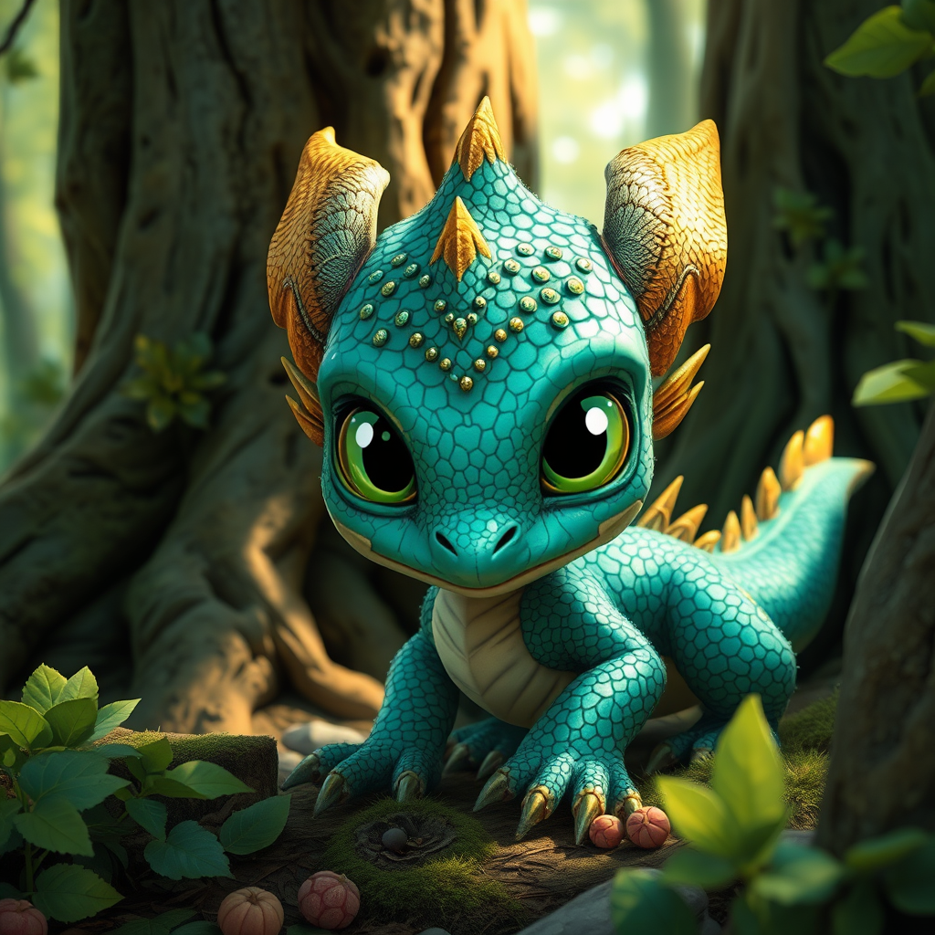 A baby dragon with large green eyes explores the forest, its teal and gold scales glistening in the dappled sunlight. Nestled near ancient trees, its sharp, prickly spines give it an air of resilience and wonder. The scene is rich with intricate, whimsical details, reminiscent of a masterful blend of Paul Barson and Kadir Nelson’s styles. A close-up reveals the dragon’s textured skin, each scale crafted with precision, as it curiously interacts with the forest’s enchanting flora and fauna.
