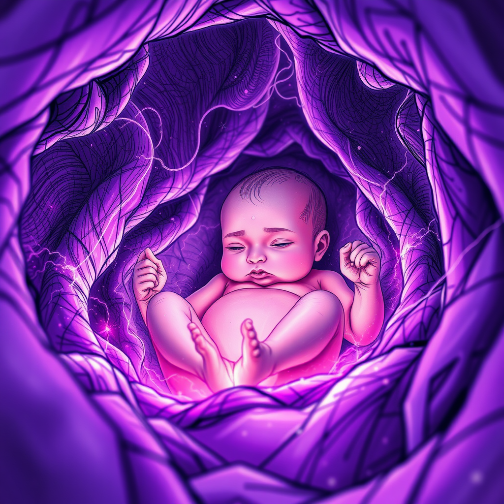 A baby in the womb enveloped by vibrant purple plasma and energy, captured in a captivating design with intricate sketching, full-body perspective from an ultra-low angle, fists clenched, cinematic essence with photorealistic detail, 8k resolution, highly detailed outlines, dynamic and blurred composition, wide angle with a touch of Ghibli cinematic style influenced by Ayami Kojima, rendered in 16k, UHD, HDR, showcasing high-resolution details, maintaining the essence of the unique and magical ambiance.