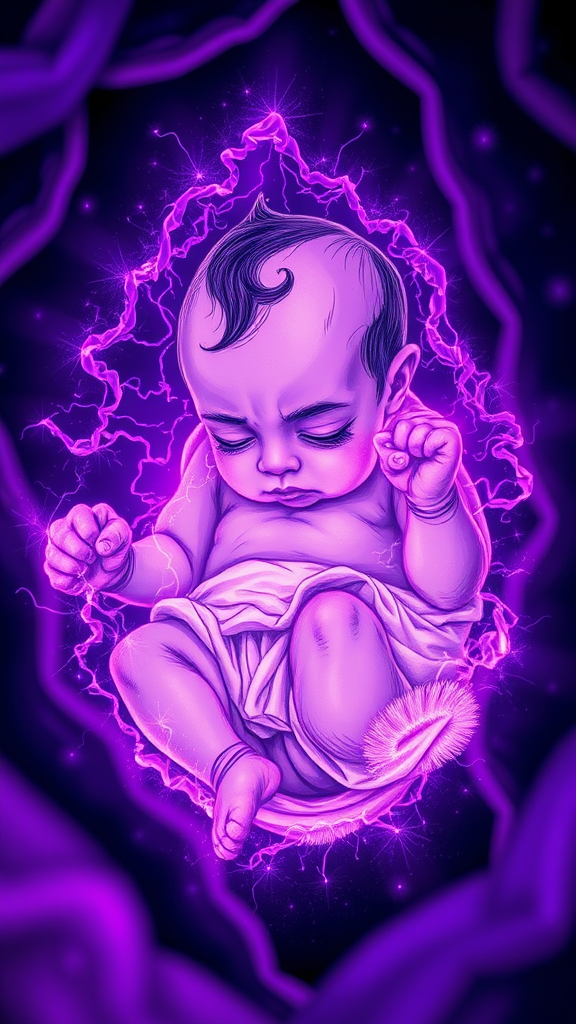A baby in the womb enveloped by vibrant purple plasma and energy, featuring a precious design with intricate sketching, capturing a full-body portrait from an ultra low angle view. The baby is depicted with clenched fists, showcasing a cinematic and photorealistic style. The composition is highly detailed with blurred and dynamic elements, utilizing a wide-angle perspective inspired by Ghibli cinematic aesthetics and Ayami Kojima's artistry. The image is rendered in 16k UHD, HDR, highlighting Absurdres quality. The depiction maintains the essence of innocence and wonder while omitting any anomalies or distortions, avoiding visual distractions such as low resolution, watermarks, logos, or text. The final image is cohesive and seamlessly integrated within its frame.