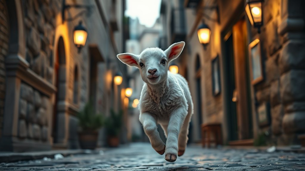 A baby lamb playfully dashing through the ancient streets of Jerusalem, its eyes sparkling with joy, surrounded by the ambient glow of dimly lit lamps, the scene captured in a cinematic and hyper-realistic style, every detail vividly enhanced, 4k resolution.