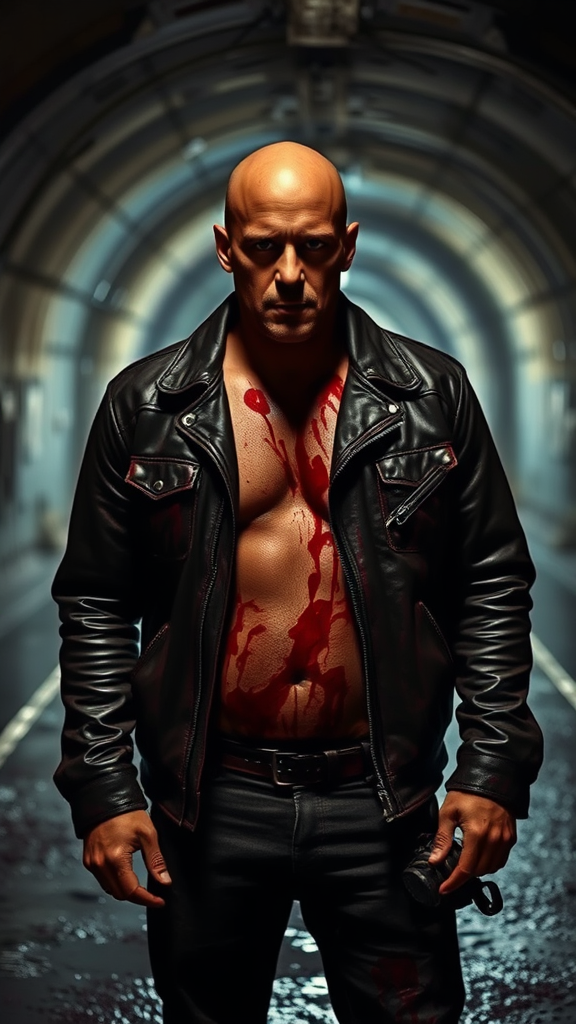 A bald man wearing a rugged leather jacket stands in a dimly lit tunnel, his face and body marked by streaks of blood, the wet floor reflecting the intense crimson hue that dominates the scene. Captured from a low angle, the photograph possesses a cinematic quality, with dynamic lighting casting dramatic shadows and a backlight accentuating the raw, intense atmosphere of the moment.