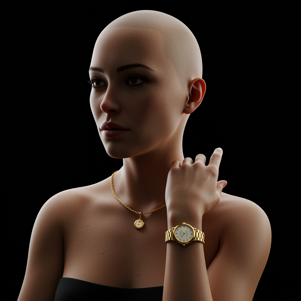 A bald woman in full stature with an elegant gold watch hanging gracefully around her neck, set against a deep black backdrop, captured in stunning 3D realism. The scene is illuminated with cinematic lighting, showcasing high detail and intricate textures, with the focus on her poised expression and the watch's gleaming allure, perfectly rendered in a portrait-style aspect ratio 9:16.