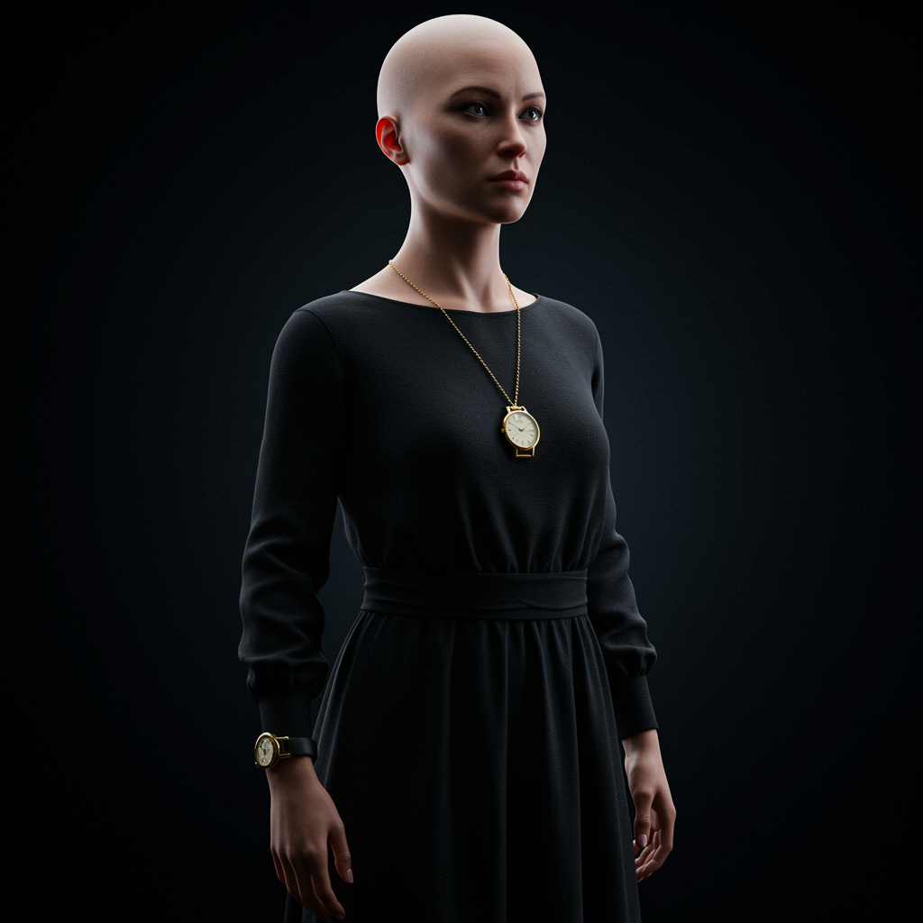 A bald woman standing tall in full view, adorned with a gold watch hanging like a pendant around her neck; set against a deep black backdrop, rendered in stunning 3D realism with cinematic lighting, capturing intricate details and creating a dramatic, high-definition scene --ar 9:16.