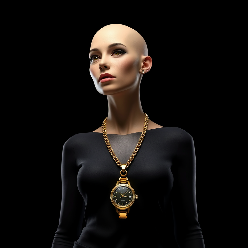 A bald woman standing tall with a luxurious gold chain draping elegantly around her neck, the pendant a glistening watch catching the eye, set against a deep, rich black background. The scene is rendered in stunning 3D realism, capturing every subtle detail with lifelike precision, the atmosphere heightened by cinematic lighting that casts dramatic shadows and highlights. The composition is vertical, emphasizing the figure's grace and strength, evoking a sense of timelessness and elegance.