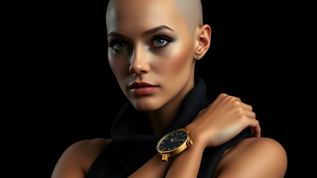 A bald woman with a sleek, gold wristwatch elegantly draped around her neck, set against a deep black background, styled in a 3D realistic render with cinematic lighting and intricate detail, capturing a high-definition, full-length portrait -- ar 9:16