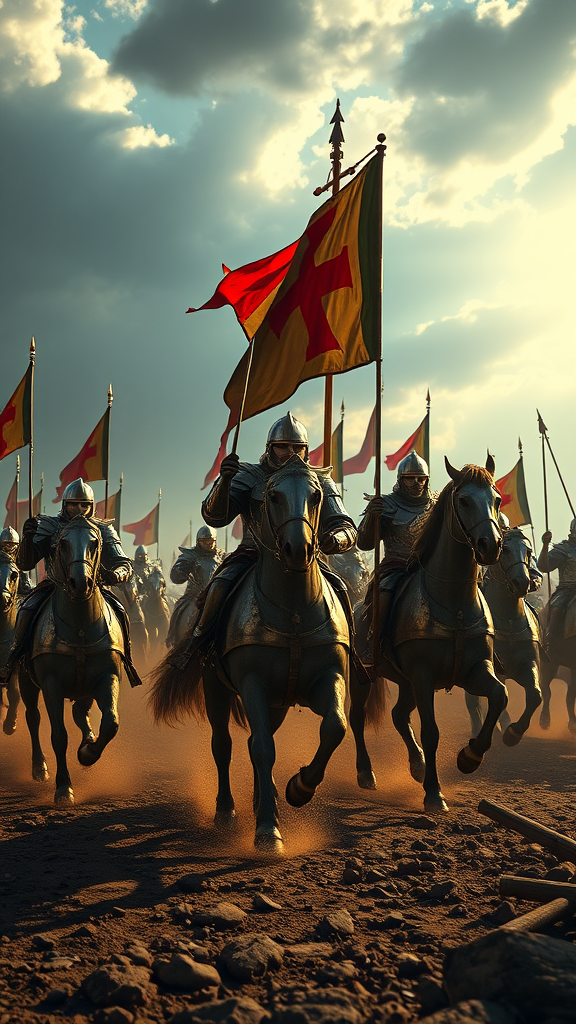 A band of Knights Templar charging valiantly into battle, their gleaming armor reflecting the sun's rays, as they carry the iconic Templar flag high. Set in the 1150s during medieval times, the scene captures the intense fervor of Christian warriors, infused with an air of mystique reminiscent of ancient secret societies. The render utilizes Unreal Engine to bring to life the intricate details of their armor and the dynamic motion of their powerful steeds, set against a dramatic 9:16 backdrop of a battle-scarred landscape.