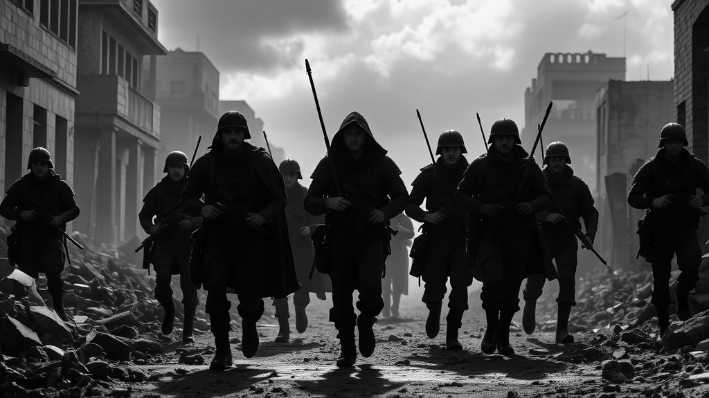 A band of valiant warriors navigates a war-torn landscape, their silhouettes stark against the monochrome backdrop. Determined expressions and unwavering camaraderie echo the enduring spirit of heroism as they march through the rubble-strewn streets, a testament to courage amidst chaos.