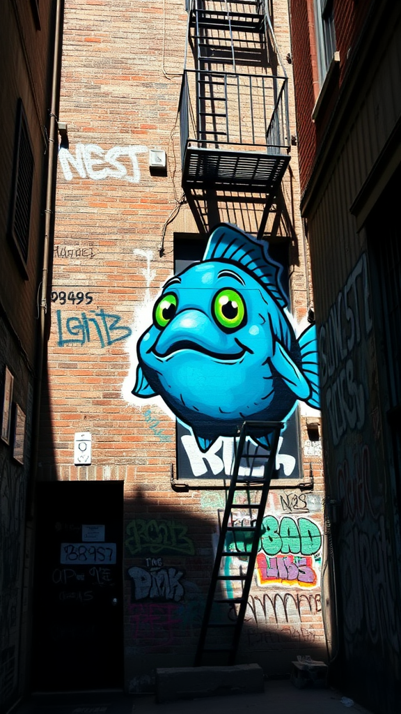 A Banksy-inspired urban graffiti artwork depicting a whimsical blue puffer fish with vibrant green eyes, playfully puffed up, appears on a weathered brick wall in a bustling New York City alleyway. The scene is animated by bold, exaggerated cartoon features with subtle hints of metallic shimmer accentuating its scales. Graffiti tags and urban motifs surround the puffer fish, creating a lively contrast between the detailed creature and the gritty street art backdrop. Shadows from a nearby fire escape ladder cast dynamic patterns across the mural, adding depth and a touch of mystery to the setting. The air is palpable with the city's electric energy, as the artwork captivates passersby with its mix of surreal whimsy and urban commentary.
