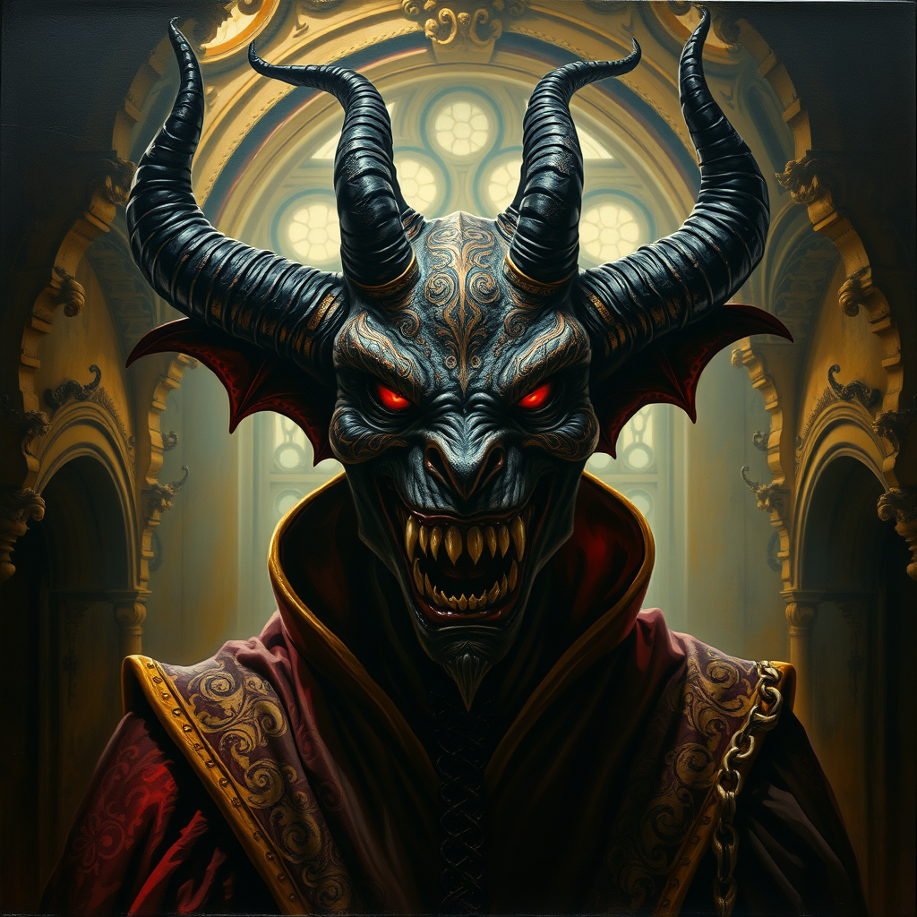 A baroque-inspired oil painting depicting a psychopathic demon with intricate, swirling patterns adorning its dark, leathery skin; its eyes are hypnotic, exuding an unnerving glow, and a wicked smile exposes sharp, jagged teeth. The background is filled with a dramatic interplay of light and shadow, highlighting the demon's elaborate, flowing robes, which are rich with gold and crimson hues. The setting is an opulent, dimly-lit chamber with ornate, crumbling stone arches, and the atmosphere is imbued with a sense of malevolent grandeur.