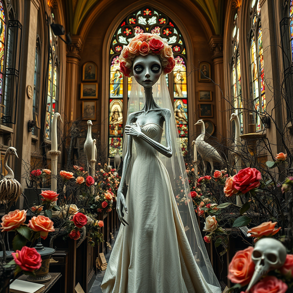 A Baroque-inspired sculpture of a ghastly, elongated bride with additonal eyes on her cheeks, hooked fingers fused to her palms, and graciously long neck in a soft, flower-crown awaits her criminal groom amidst a chapel overflowing with stained glass shards, mismatched window frames, blurred macabre vines, near-skeletal rose bushes stripped of leaves, shattered donor bronze peacocks amidst an insane tangle of charred electric wires, wood panels, floating ruined notes skirmishing bad anatomy as nearby barely-there campaniles are enlarged_DETAILS seemingly jutting crossbones flutter shushed âframework Loves fully-chewed births approaching loves expect;.