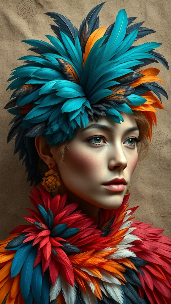 A baroque portrait of a person crafted entirely from feathers, showcasing an incredibly intricate and hyper-realistic masterpiece. The artwork embodies the elaborate and detailed style reminiscent of Tom Bagshaw, characterized by its captivating and exquisite composition. The subject matter is vibrant and full of life, with a rich texture that brings the feathered elements to life. The portrait is set against a beautifully textured background that complements the intricate details of the feathers, ensuring a harmonious and engaging visual experience. Each feather is meticulously placed to create a lifelike representation, with varied colors and textures that highlight the skillful execution and creative vision behind the piece.