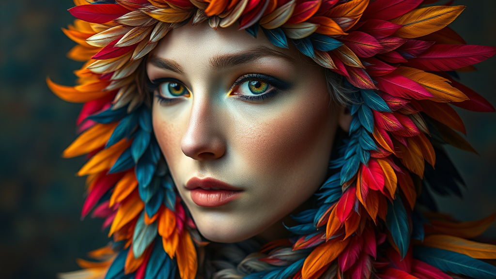 A baroque portrait of a person crafted entirely from feathers, showcasing an incredibly intricate and hyper-realistic masterpiece in the style of Tom Bagshaw, with vibrant colors and dynamic textures. The composition is outstanding with expert focus and lighting, presenting a highly detailed and engaging subject matter. The portrait exudes elegance and depth, featuring a meticulously composed and developed concept that captures the viewer’s attention through its realistic shading and rich detail. The background complements the person without overpowering the main subject, creating a harmonious and captivating visual experience.