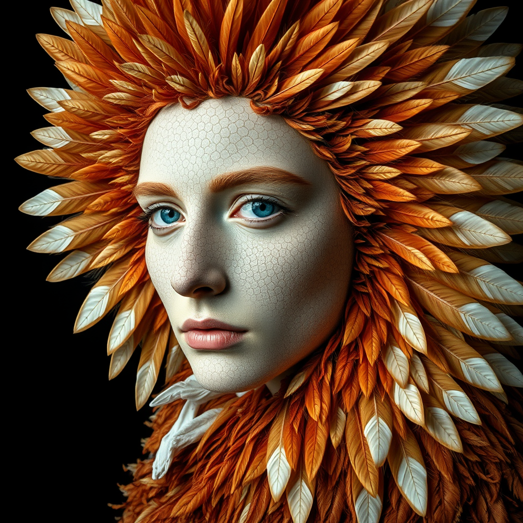 A baroque portrait of a person crafted entirely out of feathers, showcasing an intricate, hyper-realistic masterpiece with mega art qualities. The artwork captures the essence of Tom Bagshaw’s style, blending detailed elegance with imaginative creativity. The portrait radiates rich textures and vivid coloration, with a compelling composition and refined depth. The feathers are meticulously arranged to highlight the subject's expression and features, offering a lifelike presence with exquisite detailing and dynamic intrigue. The background complements the intricacy of the subject, enhancing the overall allure and providing a harmonious balance to the piece. This artwork captivates with its realistic portrayal, depth, and the unique use of feathers in embodying the baroque style.