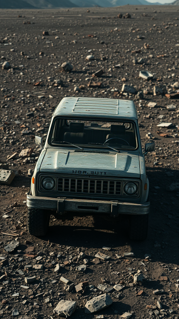 A barren and desolate landscape stretches out, with scattered rubble and debris covering the earth. Amidst the shadows stands a vehicle, its metallic surface worn and rusted from years of abandonment. The tires are deflated, and the windshield lies shattered. Rendered in low-resolution CGI with an octane style, this scene echoes a surreal, distorted sense of reality—blurred and imperfect, with objects slightly misshapen. The vehicle and surroundings fuse into a chaotic spectacle of disfigurement, filled with artifacts of an imperfect artistic occurrence.