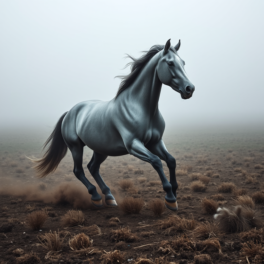 A barren field shrouded in dense fog, devoid of any trees, featuring a dynamic editorial image of a full-body, powerful gray stallion in motion. The horse's muscles ripple as it runs through the mist, captured in an epic, highly detailed shot that emphasizes its strength and grace.