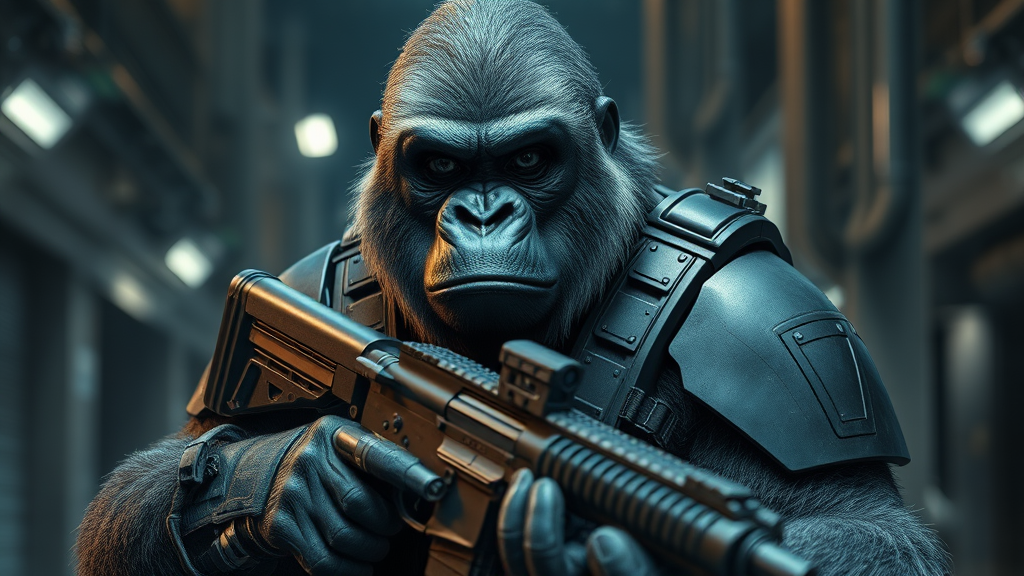A battle-hardened gorilla clad in advanced tactical armor, gripping a futuristic carbine rifle, exhibiting anthropomorphic features, showcasing intricate texture and hyper-realistic detail, captured in ultra-high definition, 8k resolution, with an emphasis on lifelike facial expressions, set against dramatic cinematic lighting, poised in a dynamic and intense posture, amid a dimly lit urban backdrop.