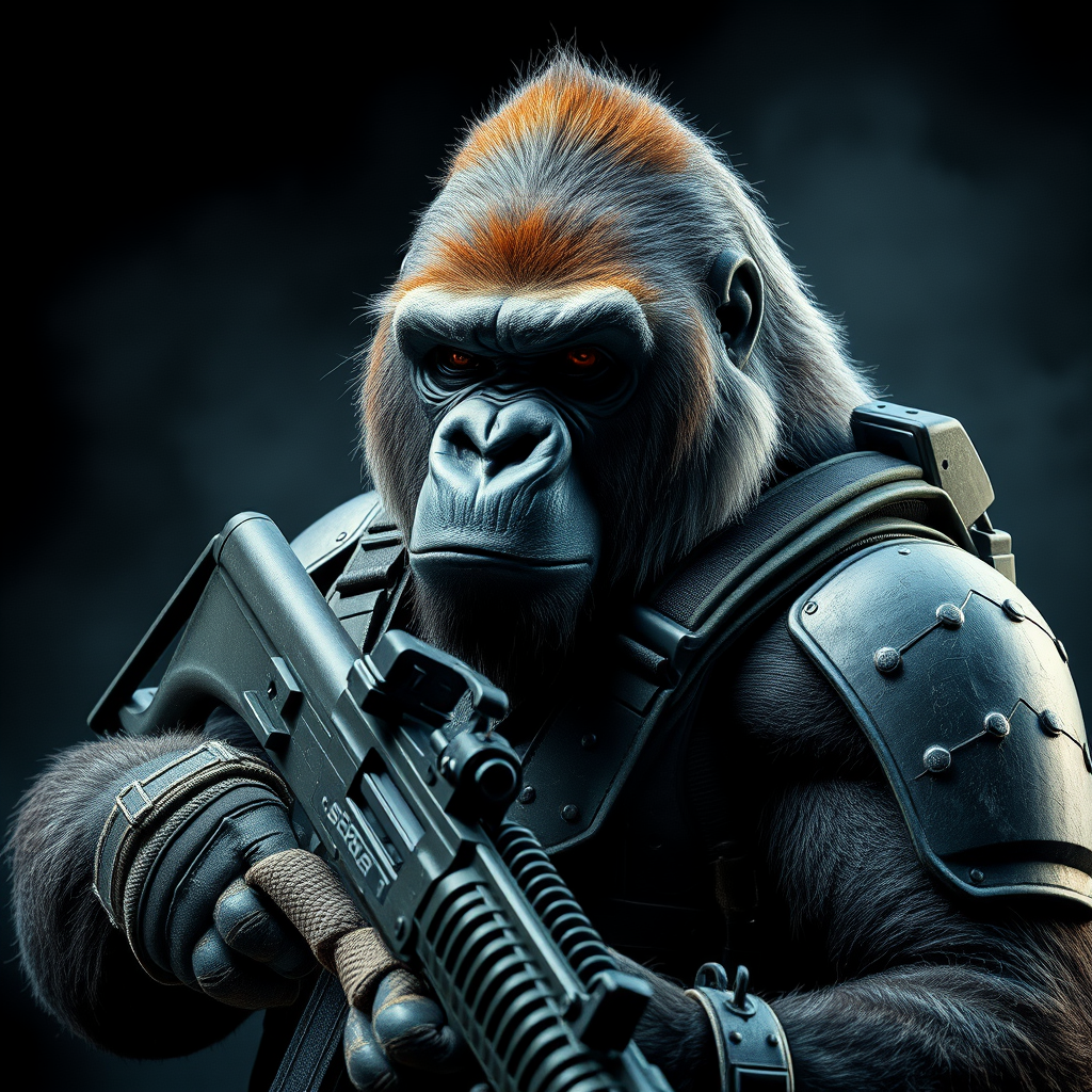 A battle-hardened gorilla clad in advanced tactical armor, gripping a sleek carbine rifle, exuding an anthropomorphic presence, showcasing intricate details and textures. The scene captures a lifelike essence with ultra-high-definition quality, maximizing realistic facial expressions in dramatic, cinematic lighting, set against an action-oriented backdrop with an epic, portrait-style composition.