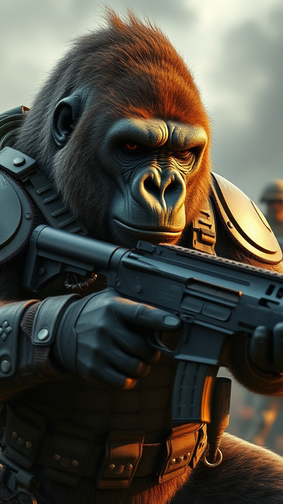 A battle-hardened gorilla clad in intricately designed military armor, gripping a sleek carbine rifle with precision, features an anthropomorphic form with lifelike skin texture that captures every ripple of muscle and weathered scar. Set against a backdrop of a smoky battlefield, its fur glistens under cinematic lighting, highlighting the intense expression of determination and wisdom etched into its face. The scene, rendered in ultra-high definition, showcases maximum facial detail, every line and contour contributing to an aura of strength and vigilance, with a rich palette of colors reflecting the early dawn’s light. The overall composition maintains a vertical aspect ratio, emphasizing the imposing presence of this resilient warrior, while the subtle play of shadows and light adds depth and realism to this striking, hyper-detailed portrait.