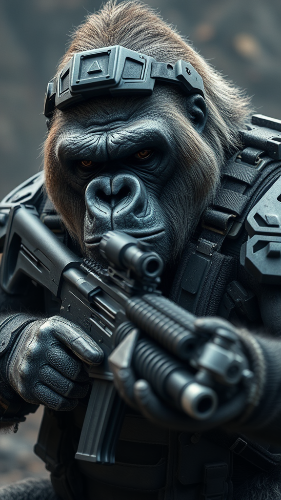 A battle-worn gorilla clad in advanced tactical armor, gripping a sleek assault rifle, embodying anthropomorphic features, captured with extraordinary detail, ultra high-definition, 8k resolution, exhibiting intricate facial nuances, dramatic cinematic lighting, positioned in a vertical aspect ratio for an imposing presence, maintaining finely tuned realism while adding an aura of fearless determination and intense focus.