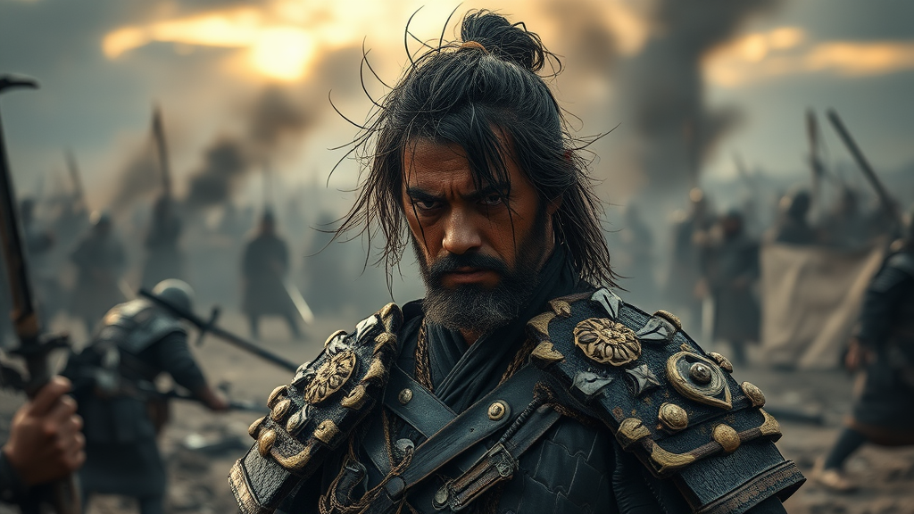 A battle-worn samurai stands amidst the aftermath of conflict, eyes locked on a distant enemy, his face a portrait of fear and exhaustion, mingled with the grime of sand and sweat, the air heavy with an ominous gloom. The hyper-realistic scene captures every detail: the tattered edges of his armor, the subtle quiver in his weary stance, and the haunting shadows cast by a setting sun. In the intensified clarity of post-production, the sharpness reveals the intricate texture of his disheveled hair, the contrast bringing out the deep lines etched by battle-weariness on his face, all subtly modified to enhance the vivid realism while maintaining the core essence of intensity and solemnity.