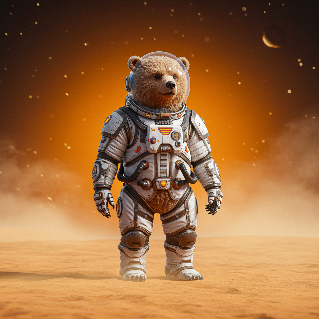 A bear clad in an intricately designed space suit stands resolutely on a dusty, otherworldly surface, exuding an air of fantasy and wonder. The color palette blends dark white and deep orange hues, casting an enchanting glow over the scene. The art style merges elements of poodlepunk with an essence of charming characters, reminiscent of a classic marine painter's touch. The surroundings are rendered in high definition, elevating the bear's demeanor to a mystical level, as if captured in a captivating moment from an alternate universe.