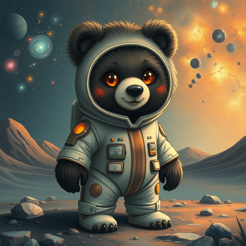 A bear in a cosmic suit stands on alien soil, its fur glinting with shades of dark white and deep orange. The scene is painted with a whimsical fantasy art style, blending elements of poodlepunk charm and flickr's playful essence. The bear's expression is captivating, its eyes reflecting the wonders of the universe. The background is reminiscent of a marine painter's touch, with waves of distant galaxies and nebulae adding depth and intrigue, captured in high definition, maintaining an aspect ratio of 10:13.