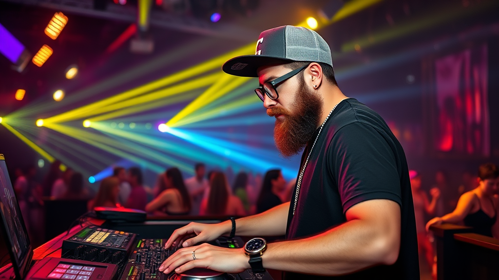 A bearded DJ sporting glasses and a black T-shirt, rocking a snapback cap, immersed in his music setup at an electrifying nightclub, where pulsating cinematic lights amplify the vibrant party atmosphere.