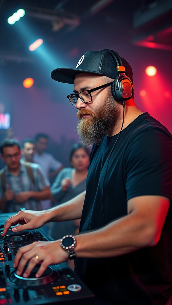 A bearded DJ sporting stylish glasses and a sleek baseball cap, dressed in a crisp black T-shirt, masterfully controls the pulse of a lively nightclub. Bathed in cinematic lights, he orchestrates an unforgettable night of entertainment through his headphones amidst the vibrant energy of the party.