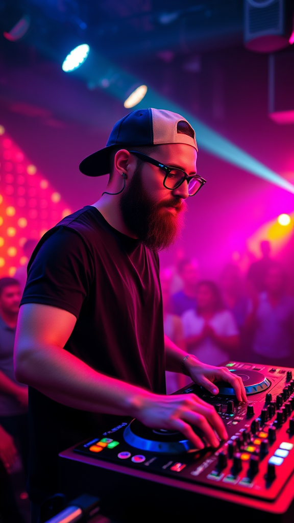 A bearded DJ sporting thick-rimmed glasses and a backwards baseball cap, clad in a sleek black T-shirt, masterfully mixes tracks at the pulsating heart of a lively nightclub, where vibrant cinematic lights dance across the crowd.