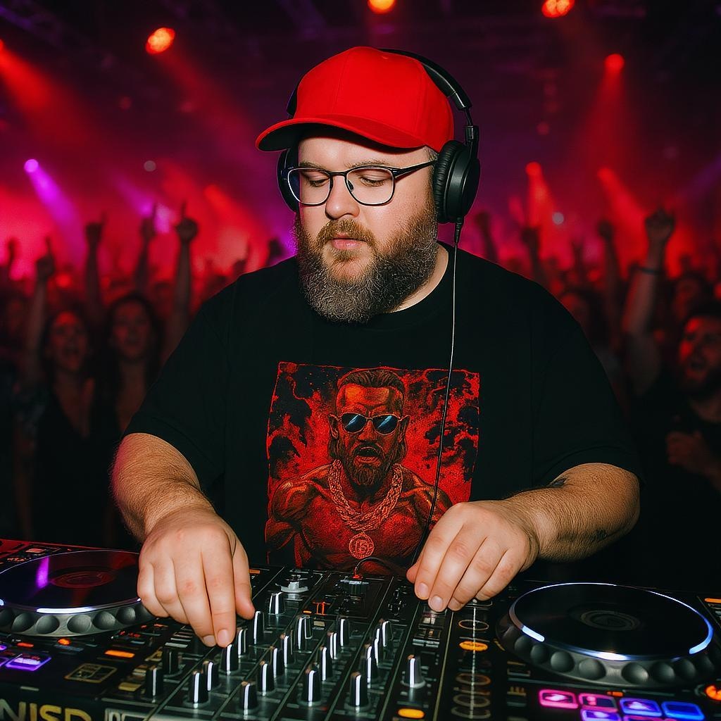 A bearded DJ wearing stylish glasses and a bright red baseball cap paired with a graphic black T-shirt, spinning tracks with his headphones on at an energetic nightclub, surrounded by dazzling cinematic lights and an electrified crowd.