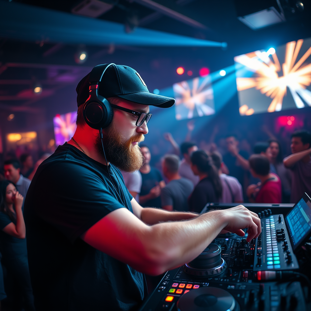 A bearded DJ with glasses and a baseball cap spins tracks at a lively nightclub, wearing a sleek black T-shirt and headphones, surrounded by dazzling cinematic lights and an energetic crowd.