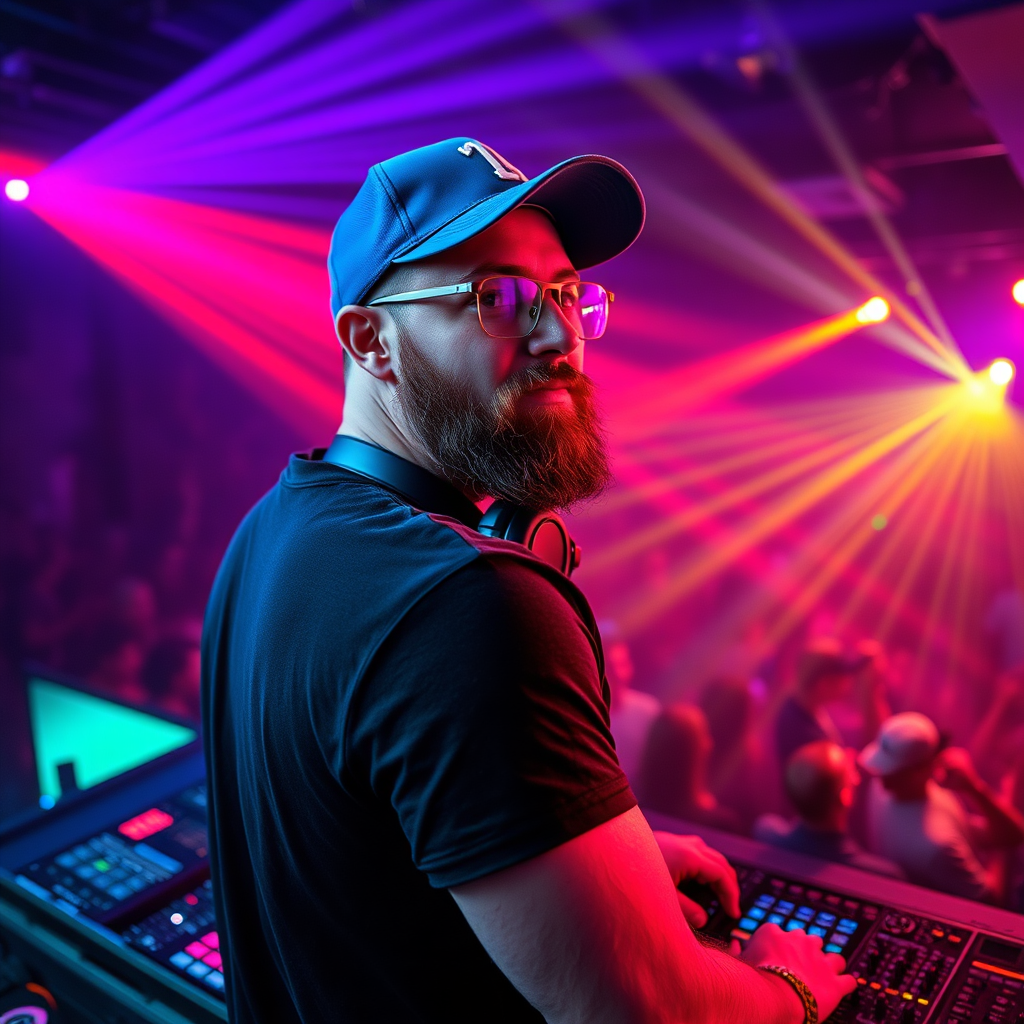 A bearded DJ with glasses, sporting a blue baseball cap and a stylish black t-shirt, stands behind the DJ booth. His headphones rest casually around his neck as he commands the energy of a pulsating nightclub. The room is alive with vibrant dance music, and cinematic lights sweep over the crowd, creating a kaleidoscope of color and motion.