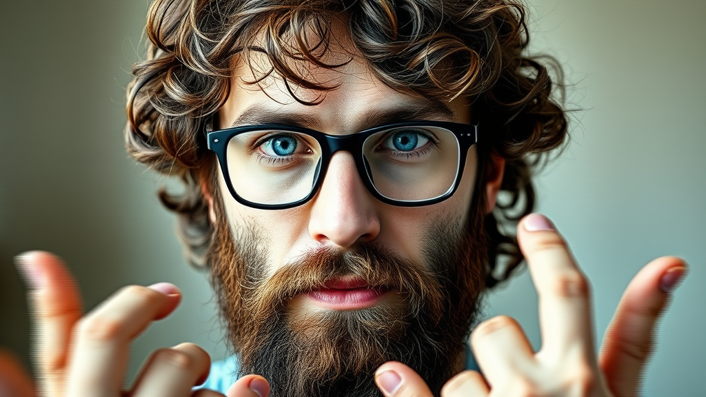 A bearded man with curly brown long hair and blue eyes, wearing glasses. The composition contains intentional imperfections such as blurred or low-resolution areas, slight errors in anatomy, and digital artifacts. The image might appear as if it's cropped or incomplete, possibly featuring distorted hands with missing or extra fingers. There may be elements like text or signs of watermarks, a signature, or artist name, reflecting an experimental, abstract style in varied quality.