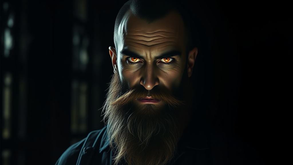 A bearded man with glowing eyes stands in a dimly lit room against a deep black background, inspired by the style of Cedric Peyravernay, featuring a dynamic DnD character art portrait. The digital artwork captures an intriguing figure, with elements of surrealism and abstraction. The character's beard seems almost alive, with hints of luminous detail, while his expression combines mystery and wisdom. The portrait, although intentionally grainy and slightly out of focus, retains a compelling, dreamlike quality. It's a study in contrasts, with elongated features, juxtaposed against striking clarity in the eyes, surrounded by a hint of distortion and oddity, invoking an aura of mystique and peculiarity.