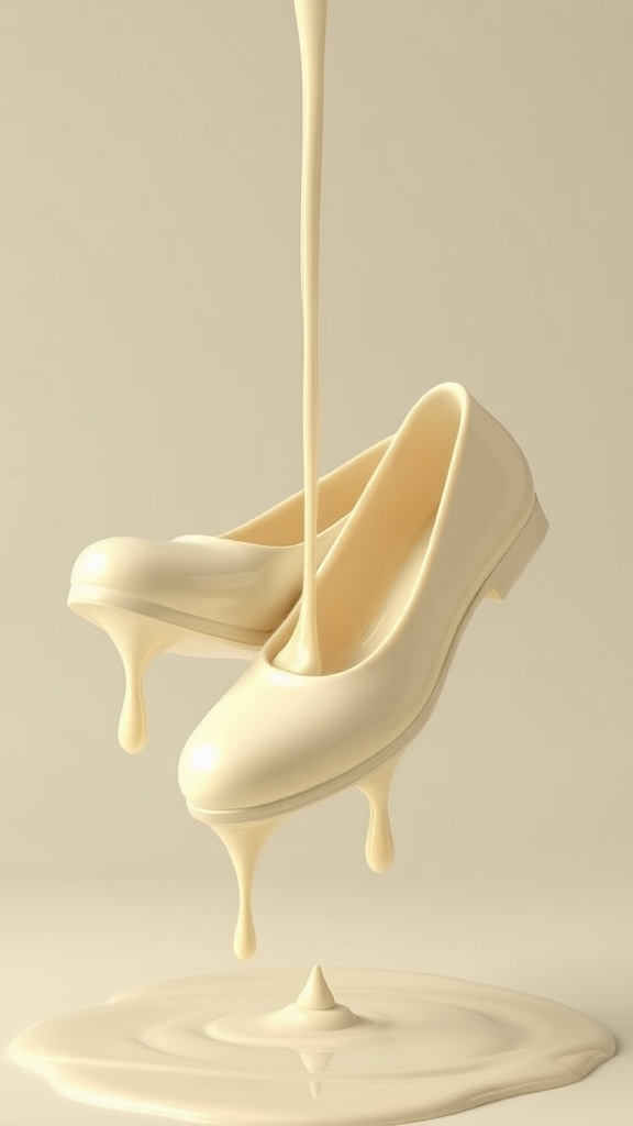 A beautiful 3D render of a pair of white chocolate shoes elegantly floating in mid-air, delicately melting and dripping with glossy river-like streams of chocolate, capturing a clean and artistic composition in a stunning illustration.