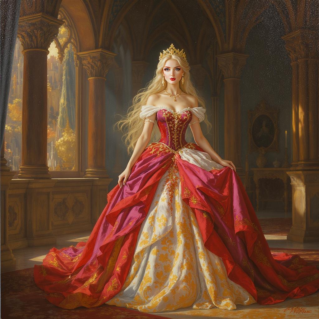 A beautiful and aesthetic vintage fairytale art piece featuring a single princess with intricate details and ultra detailed features. The scene is set in a spire room with cinematic lighting casting detailed shadows. The focus is on a lovely blonde princess with a gorgeous, detailed face, wearing a colorful indoor ballgown that captures the elegance and charm of a fairytale come to life. The image is full body, capturing the grandeur of the setting in UHD, HDR, 8K quality, ensuring a crystal-clear presentation with vibrant colors. The composition highlights her poised stance and the elegance of her surroundings, while minor creative adjustments elevate the fantastical atmosphere. The artwork avoids any distortions or imperfections, maintaining a perfect, stunning visual.