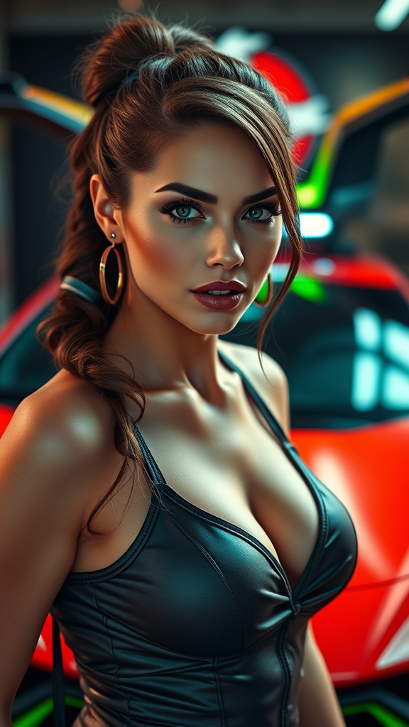A beautiful and alluring female Ghostbuster, seen in a sleek viquini, stands confidently in front of a vibrant, customized Lamborghini Ghostbusters car. Her eyes flirtatiously engage the viewer with a playful bow, her exquisitely detailed skin and photo-realistic features captured in stunning 8k resolution. A hint of a piercing adds to her charm, as diffused soft lighting casts a glow, enhancing her allure in sharp focus. Shallow depth of field and cinematic lighting create a hyperrealistic portrait, as the camera captures her full-length form with high detail RAW color, making her an irresistible vision against the carβs polished backdrop.