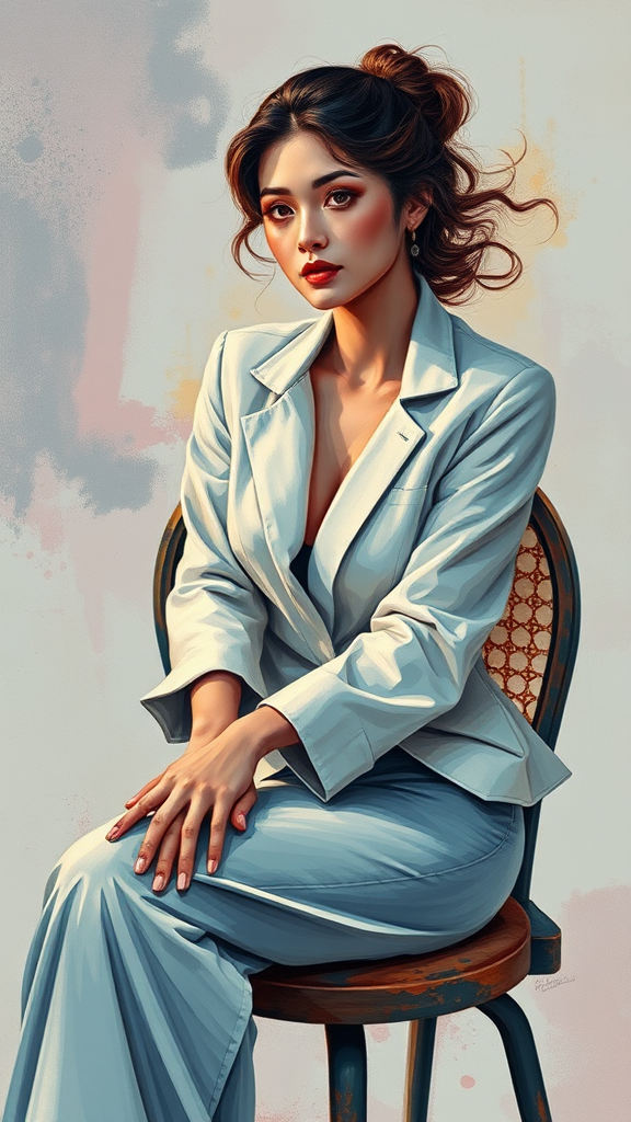 A beautiful and intricately detailed painting of a stylish woman sitting gracefully on a chair, inspired by the artistic styles of Conrad Roset, Greg Rutkowski, and Makoto Shinkai. The composition exudes elegance and sophistication, capturing the serene ambiance and subtle interplay of colors and light. The artistry reflects a harmonious blend of soft, flowing lines with vibrant, dynamic elements, emphasizing the woman's poised expression and fashionable attire. The background offers a gentle, abstract complement to the main subject, enhancing the overall serene and captivating aesthetic of the piece. This artwork is both contemporary and timeless, showcasing an exquisite balance of artistic skills and visionary creativity.