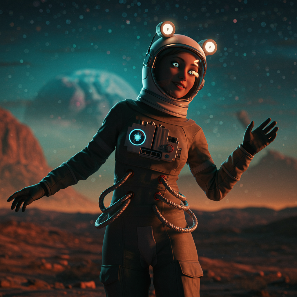A beautiful astronaut, with perfect eyes, dances and smiles against a mesmerizing alien landscape. The scene is cinematic, like a masterpiece, with stunning and captivating lighting. Despite a backdrop that challenges any artist’s imagination, this creation sings with elegance and charm. The astronaut's expression and movements are a harmonious blend of joy and curiosity, making this an unforgettable visual experience.