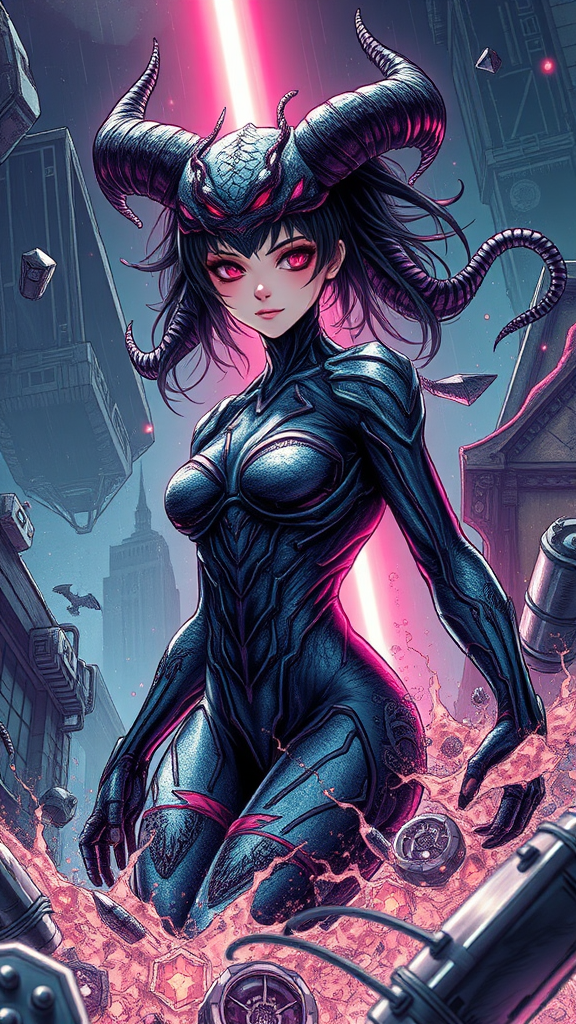 A beautiful demon girl in a Tsutomu Nihei-inspired futuristic style, adorned with symbiotic textures reminiscent of Venom, set in a Marvel-like universe. Her form is surrounded by hyper-detailed sci-fi elements, with a vibrant laser beam cutting through the center and descending from the sky, creating dynamic energy clots. The scene is filled with a sense of acceleration and speed, enhanced by flashes of light and intricate drawings. The setting is ultra-detailed, with visible particles and a seamless fusion of materials that showcase symmetry. Rendered in 8k comic graphics, the artwork features contour lighting, a deep depth of field, and spotlight effects. Seen from a first-person perspective, it is presented in HD super-resolution, capturing every nuance with unparalleled clarity.