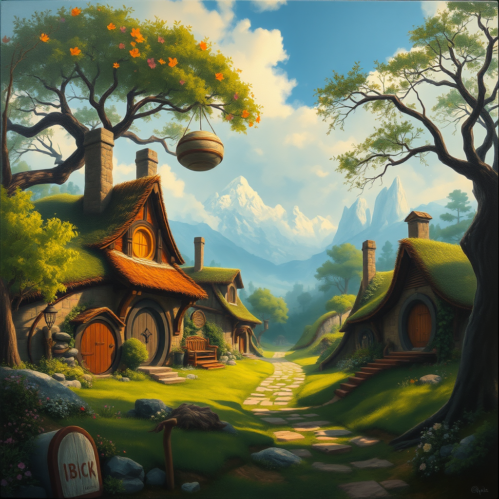 A beautiful, enchanting scene of a hobbit's shire, captured in a full shot body photo, showcasing the most stunning artwork. This serene, picturesque landscape is reimagined as a professional, majestic oil painting crafted by visionary artists like Ed Blinkey, Atey Ghailan, and inspired by Studio Ghibli. The scene carries the expressive brushstrokes of Jeremy Mann, Greg Manchess, and Antonio Moro, making it a trending piece on ArtStation and CGSociety. With intricate high detail and sharp focus, the painting is dramatic and photorealistic, yet embodies a SylvaMagic style. It features a canvas frame and a unique blend of cartoonish and 3D elements. The colors, while slightly unconventional, contribute to the charm without detracting from the beauty. Though maintaining integrity to the whimsical nature, the art avoids imperfections, ensuring superb anatomy and proportion. It's a testament to the harmony between imagination and artistic excellence, a visual sanctuary free from flaws, earning place among the cherished masterpieces of fantasy art.