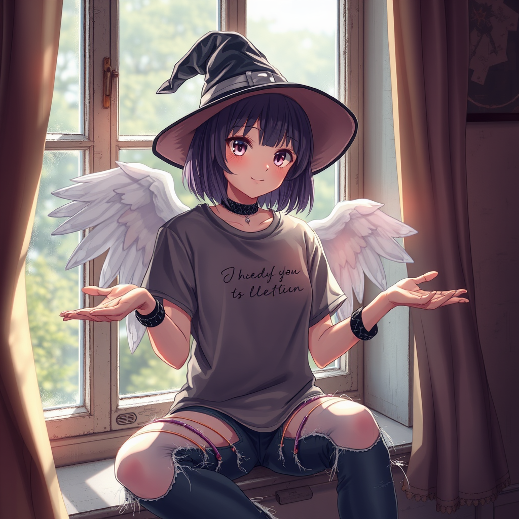 A beautiful illustration of a punk-inspired girl sitting by the window, holding a metallic sheet in outstretched hands, wearing a punk-style t-shirt and torn leg clothes, with a cute, sweet anime-like face and sheer blush cheeks. She dons a translucent witch hat, surrounded by an old room radiating modelshoot vibes, enhanced by high saturation and volumetric lighting. The scene captures a female angelic presence with a focus solely on her, bringing out her pretty face and casual clothes. Her ensemble is completed with ripped pants and a whimsical, translucent aura, all rendered in stunning 8K detail.