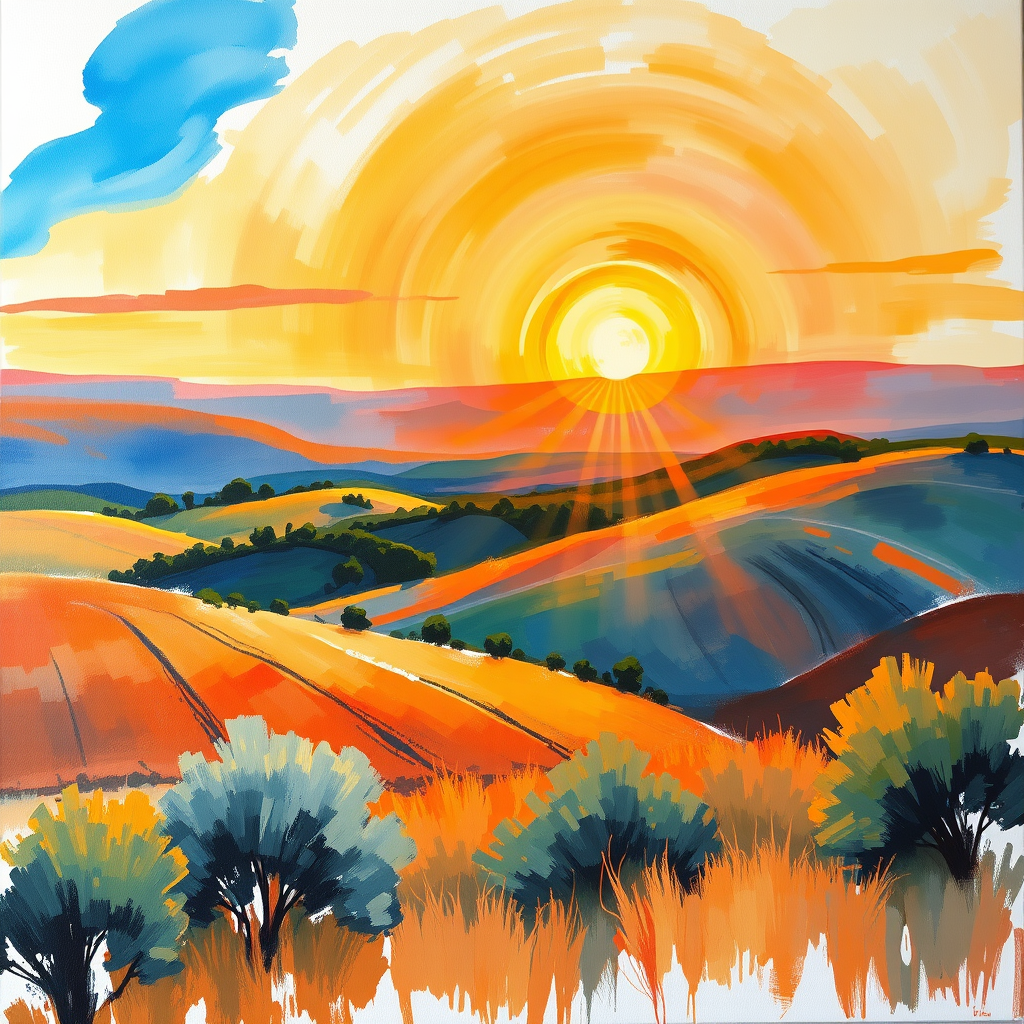 A beautiful impressionist painting depicting a radiant sunset over the rolling hills of Provence, painted with delicate and fluid brushstrokes. The scenery is bathed in a warm palette of golden hues, orange, and soft pinks, reminiscent of the impressionist masters' exquisite technique. The elongated canvas format captures the sweeping landscape, emphasizing the serene beauty and tranquil charm of the evening glow over the picturesque countryside.
