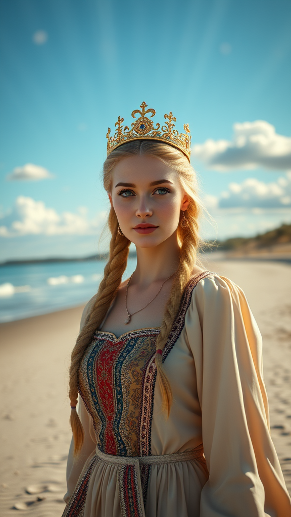 A beautiful Russian princess wearing a golden crown and a traditional Russian dress gracefully walks along a beach with a clear blue sky and fluffy clouds overhead, and a serene body of water nearby. Her long, braided blonde hair flows elegantly behind her, complementing her enchanting gaze and alluring expression. Her symmetrical eyes and striking facial features are captured in an ultra-realistic manner, resembling a cinematic film still from the 1980s, with the warm tones typical of Kodak Portra 800 film. The scene is enveloped in magical, radiant light rays, with specks of dust floating in the beams, creating a late afternoon, almost heavenly ambiance. Her detailed attire and realistic skin texture are emphasized through meticulous digital rendering techniques, showcasing photorealism akin to a polished 3D render. Despite this detailed realism, the image maintains a dreamlike quality, with a slightly moody, misty atmosphere. The lighting, shadow play, and analog style contribute to the enchanting aesthetic, evoking a nostalgic, magical feeling, as if captured by a vintage camera.
