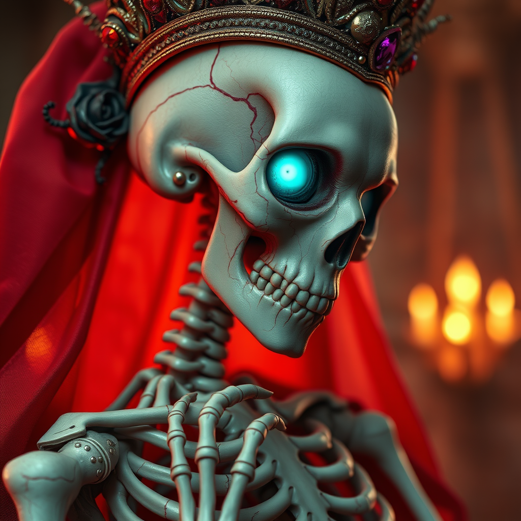 A beautiful skeleton woman dressed in regal garments, reigning as queen of the underworld, with vibrant colors accentuating her eye area. Her hollow eyes gaze into eternity, surrounded by a delicate network of blood and veins. The scene is intricate and detailed, capturing a sideway pose of this living dead figure—a morbid, unholy presence. Enlightened by fantasy, the portrayal is extremely intricate, cinematic, hyper-realistic, and hyper-detailed. Rendered in cinematic style with absurd resolution, 4k, 8k, UHD, HDR—evoking the quality of an octane render and the sophistication of an unreal engine—while avoiding distortion and maintaining perfect anatomy. The depiction showcases seamless limbs and features, with beautifully drawn hands and proportional eyes. A cohesive and high-quality vision with artistry that transcends imperfection.