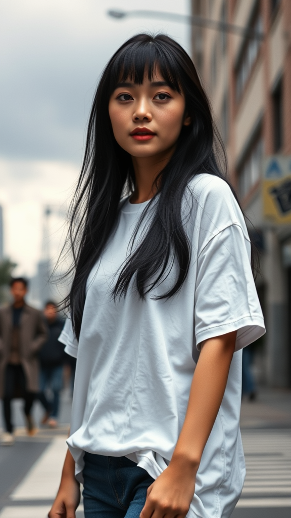 A beautiful South Korean girl with long black hair and soft bangs strolls down a city street, wearing an oversized fashion white t-shirt that gently flutters in the breeze. An overcast sky lends a moody backdrop, enhancing the drama of the scene. Her subtle makeup accentuates her natural features, and the diffused lighting casts a cinematic glow. The photo captures every detail in stunning clarity, as if shot on high-quality film, creating a captivating and photorealistic image.