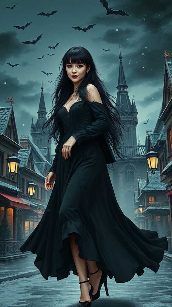 A beautiful vampire woman strolls through a Victorian city in winter, her long, black hair cascading over a detailed, symmetrical face framed with bangs. She wears an enchanting smile, her reflective eyes accentuated by mascara and makeup. Dust particles dance around her, caught in the dramatic chiaroscuro lighting. Her black vampire dress elegantly complements her manicured nails and high heels. With a pelvic curtain swaying, she moves gracefully past a gothic castle, beneath a night sky filled with bats, stars, and dark clouds. The scene captures the essence of a majestic impressionistic oil painting, inspired by the styles of Waterhouse, John Constable, Ed Blinkey, and modern artists like Jeremy Mann and Greg Manchess. The artwork's intricate details and dramatic atmosphere evoke the storytelling of Studio Ghibli and the visual splendor of Makoto Shinkai's Kyoto, while trending on platforms like ArtStation and CGSociety.