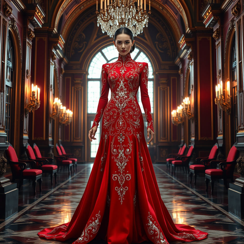 A beautiful woman in a striking red gown crafted from rubies and shimmering diamonds, featuring intricate details, soft silk, and textured brocade, stands elegantly in a Sci-fi Victorian great hall. Her dress, a sophisticated turtleneck bridal gown, captures the essence of a high-fashion show, blending traditional elegance with a futuristic twist. The room is illuminated with cinematic lighting, enhancing the ultra-realistic, symmetrical composition that showcases her beauty. The gown, reminiscent of Peter Mohrbacher's artistry, is captured in 8k and 4k resolution, emphasizing its brilliance and refined craftsmanship, exuding sophistication akin to wedding photography.