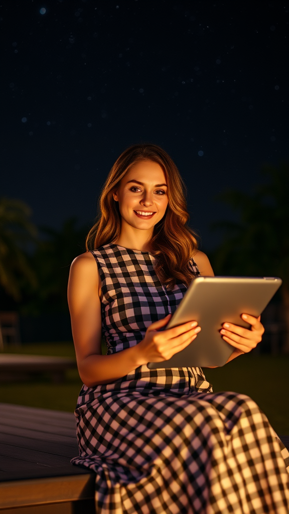A beautiful woman seated under the stars, holding a sleek tablet, dressed in an elegant checkered dress, outdoor setting at night, enveloped in soft, atmospheric lighting, capturing the essence of reality, exceptionally detailed, with a gentle play on contrast, akin to a high-quality photograph.