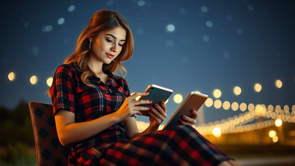 A beautiful woman seated with a digital device, dressed in a sophisticated tartan dress under a starry night sky, ambient glow of soft lights, realistic and intricately detailed, capturing the essence of real-life photography with a gentle contrast, ultra high-definition quality.